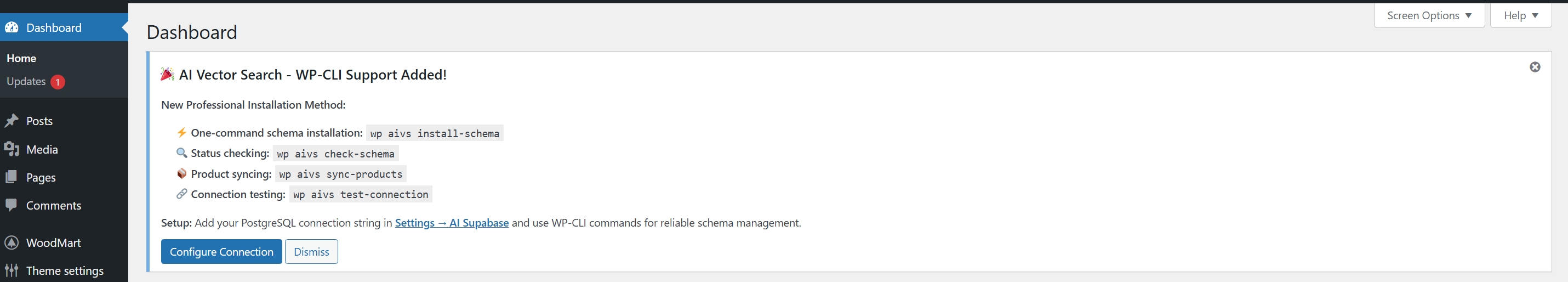 - Dashboard notice showing new WP-CLI support and quick setup actions.