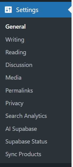 - Settings menu entries added by AI Vector Search (Search Analytics, Supabase Status, Sync Products).