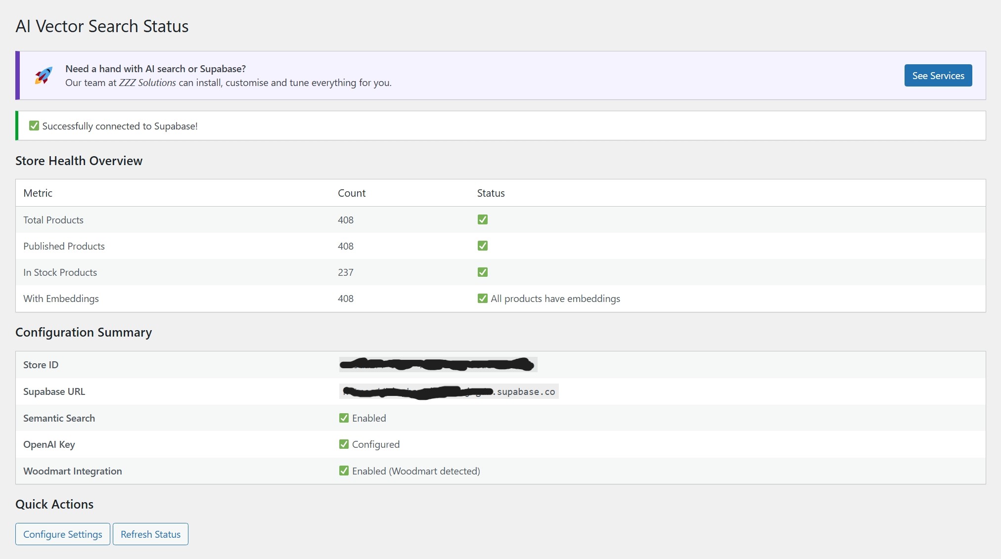 - Main plugin settings page with Supabase and OpenAI configuration, plus WP-CLI schema installation.