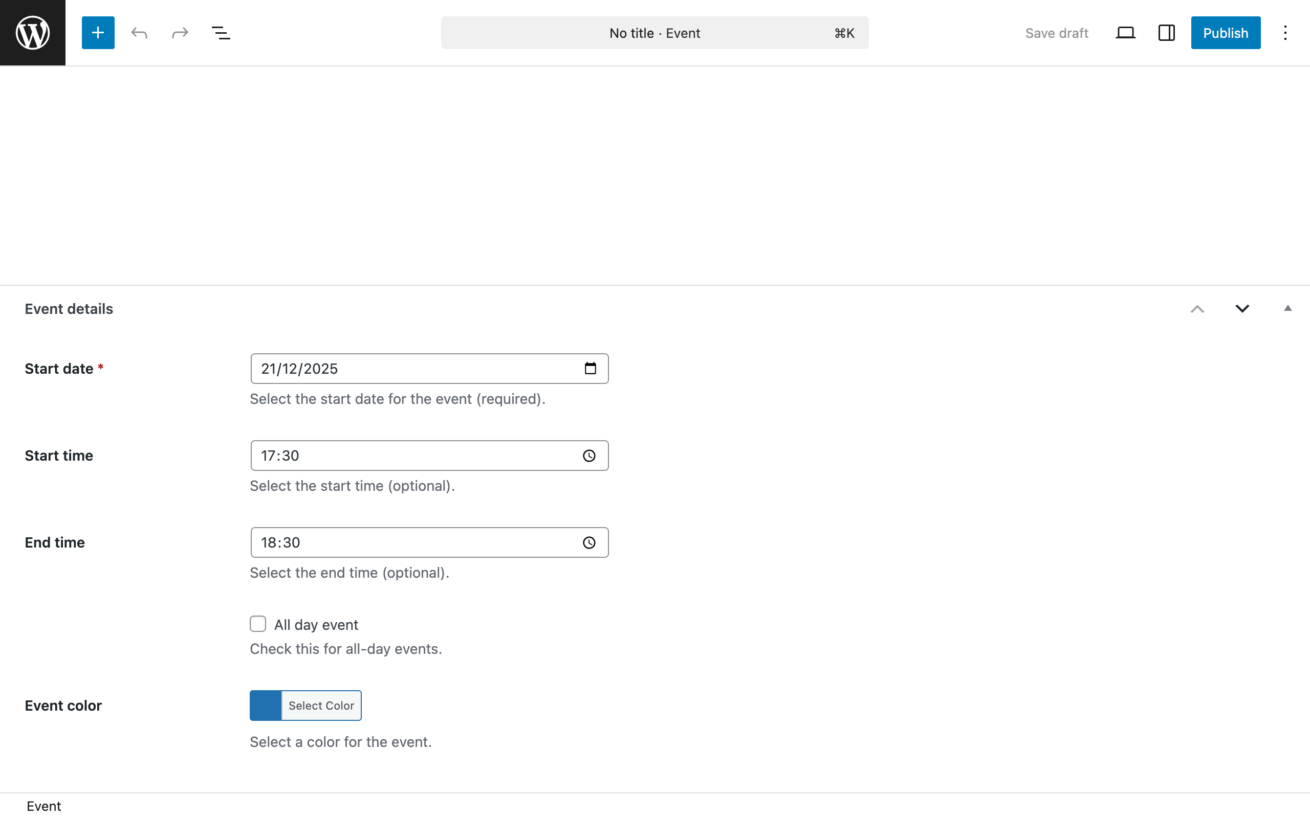 Yes! The plugin uses the date and time formats configured in your WordPress Settings General. All events, blocks, and shortcodes automatically use these formats for consistency across your site. To change the formats, simply update them in your WordPress general settings.