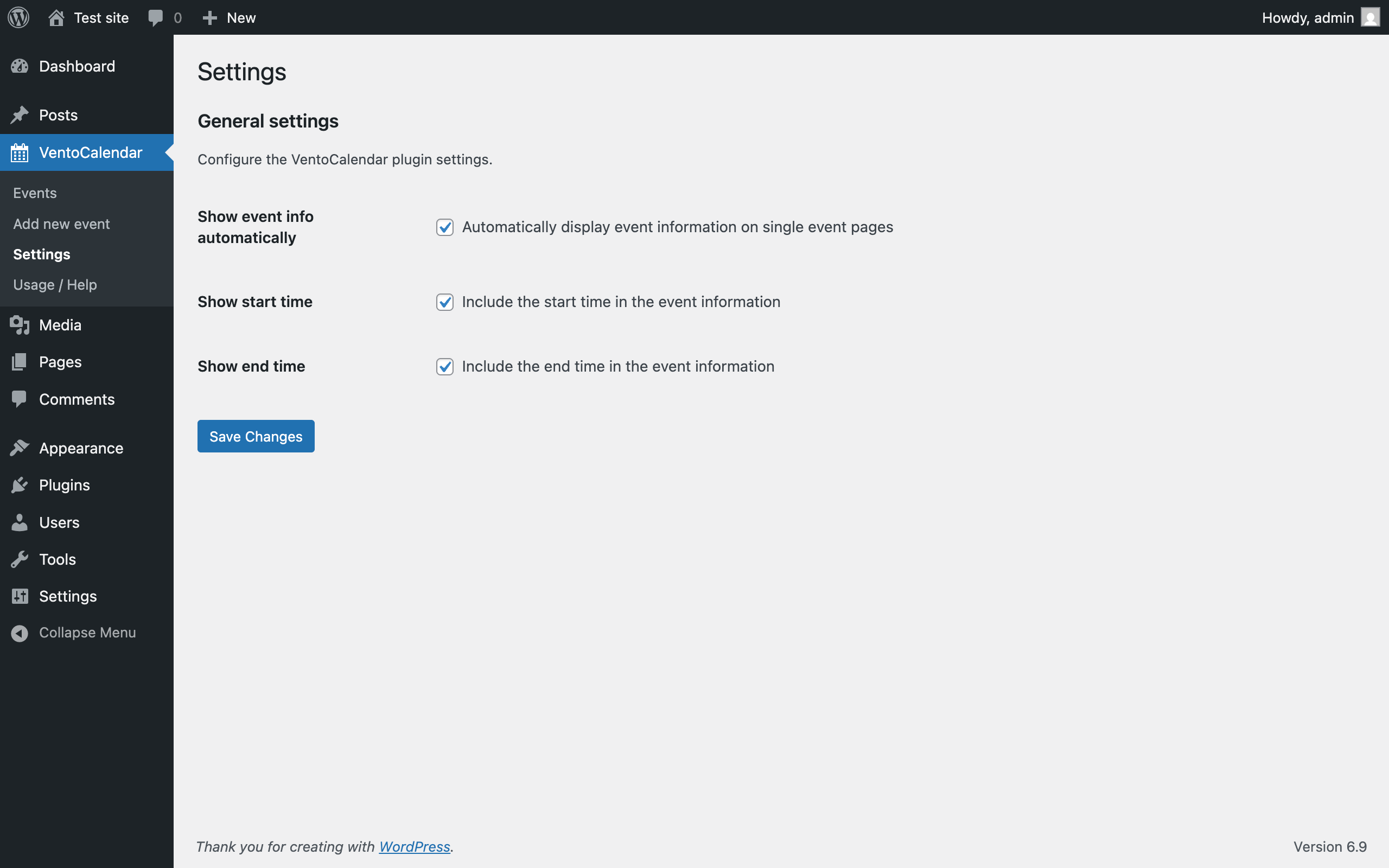 Go to VentoCalendar Settings and check “Automatically display event information on single event pages”. You can choose whether to display the start and end times. Date and time formats use the WordPress general settings.